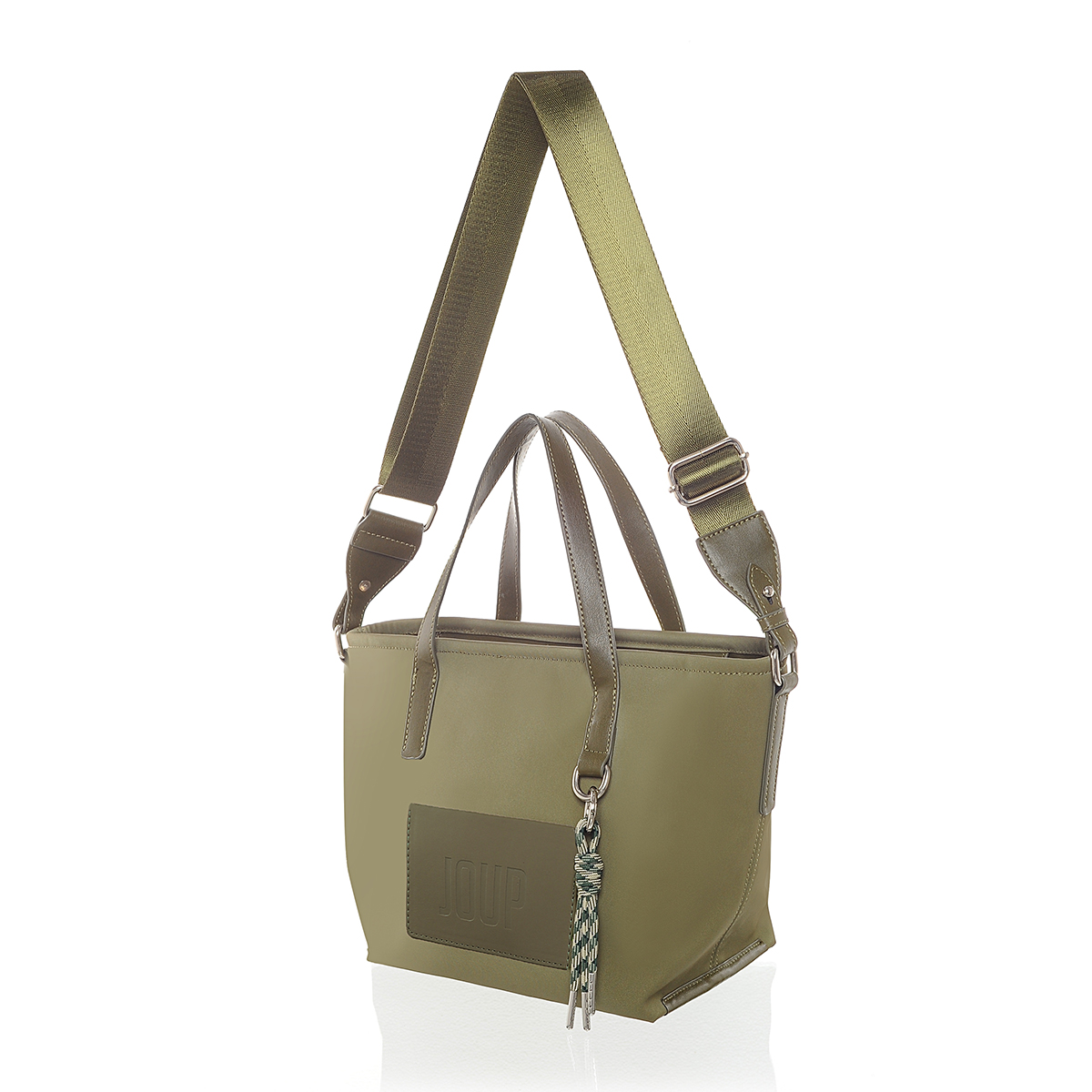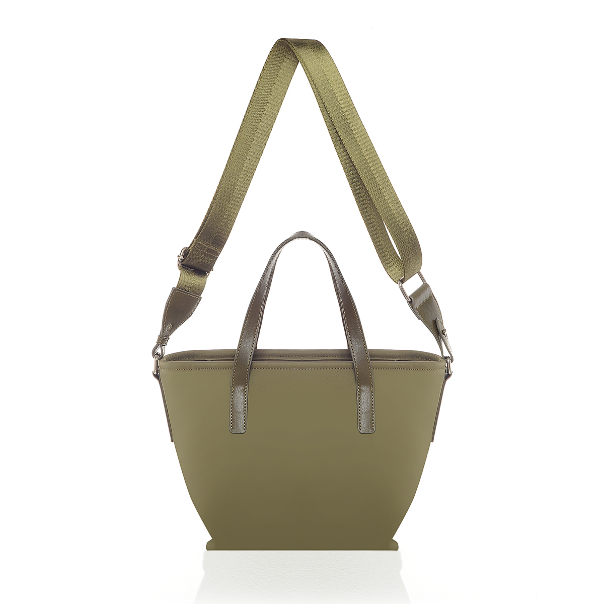 Bandolera de PU liso combinado, con bolsillo delatero con logo grabado y llavero extraible. Cuenta con correa larga regulable y extraible.