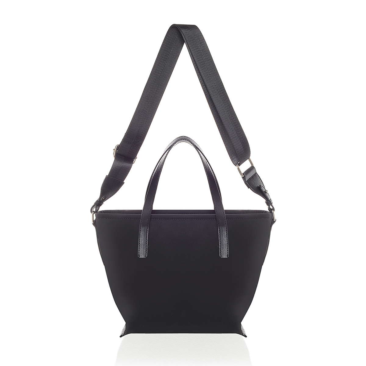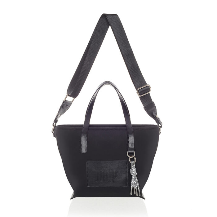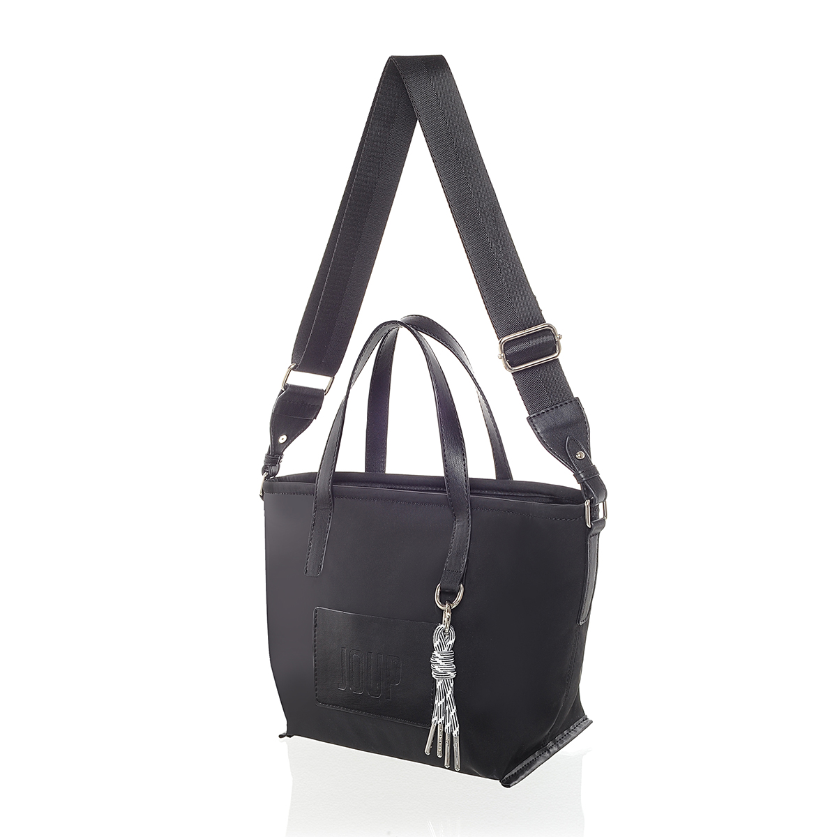Bandolera de PU liso combinado, con bolsillo delatero con logo grabado y llavero extraible. Cuenta con correa larga regulable y extraible.