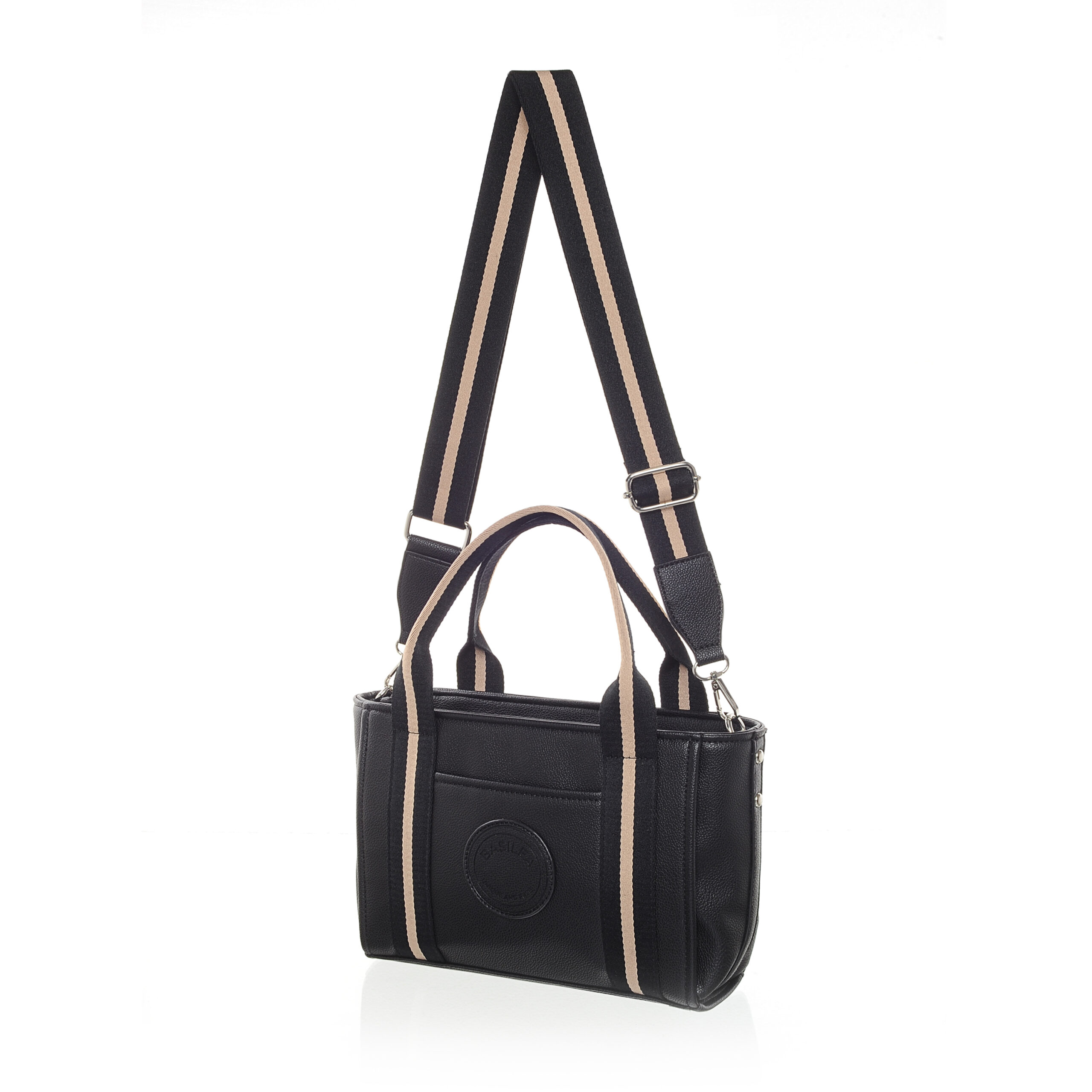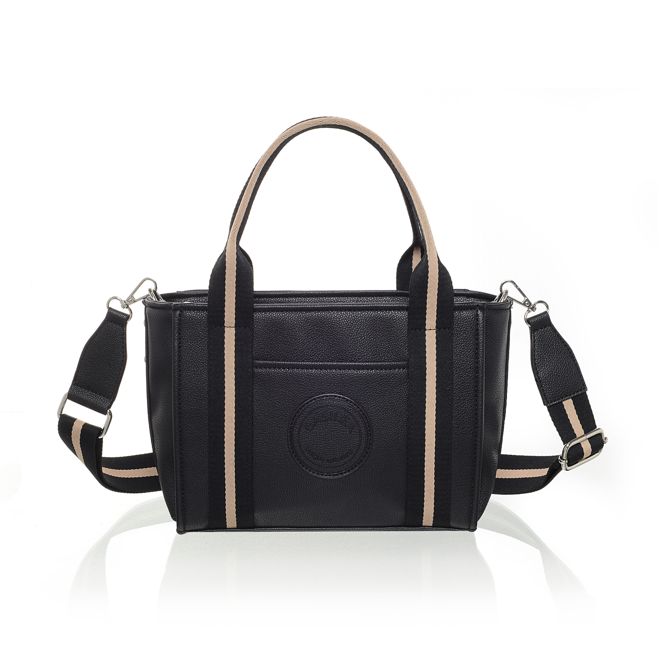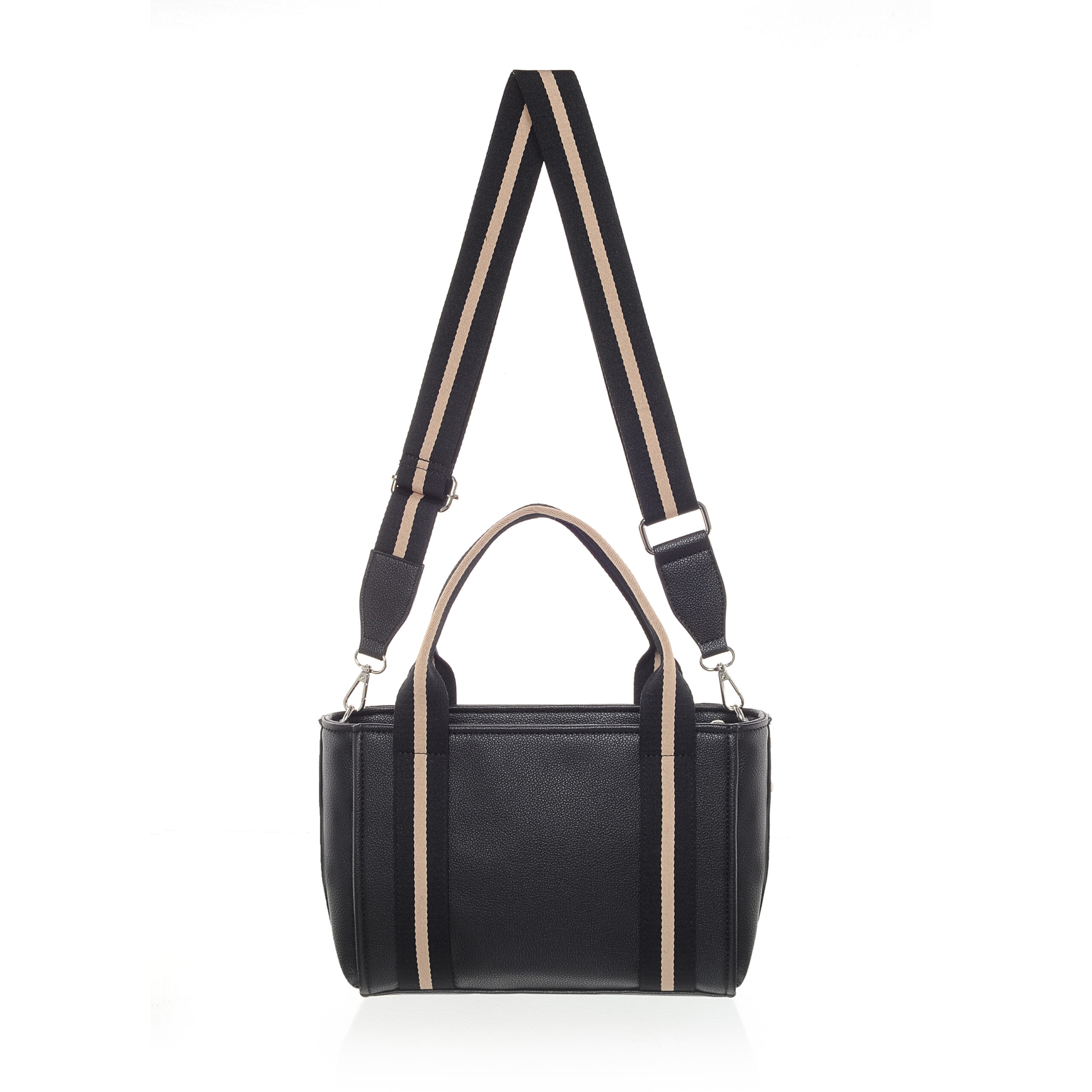 Bandolera de PU con cinta bicolor de nylon, bolsillo frontal y logo grabado. Cuenta con correa larga bicolor de nylon regulable y extraible.