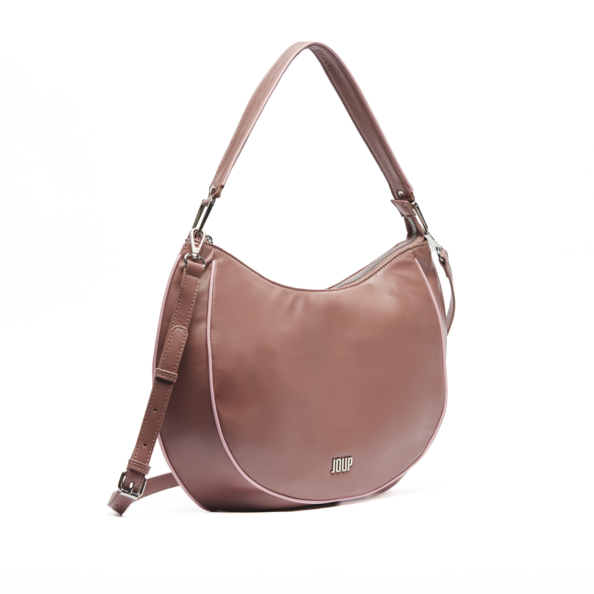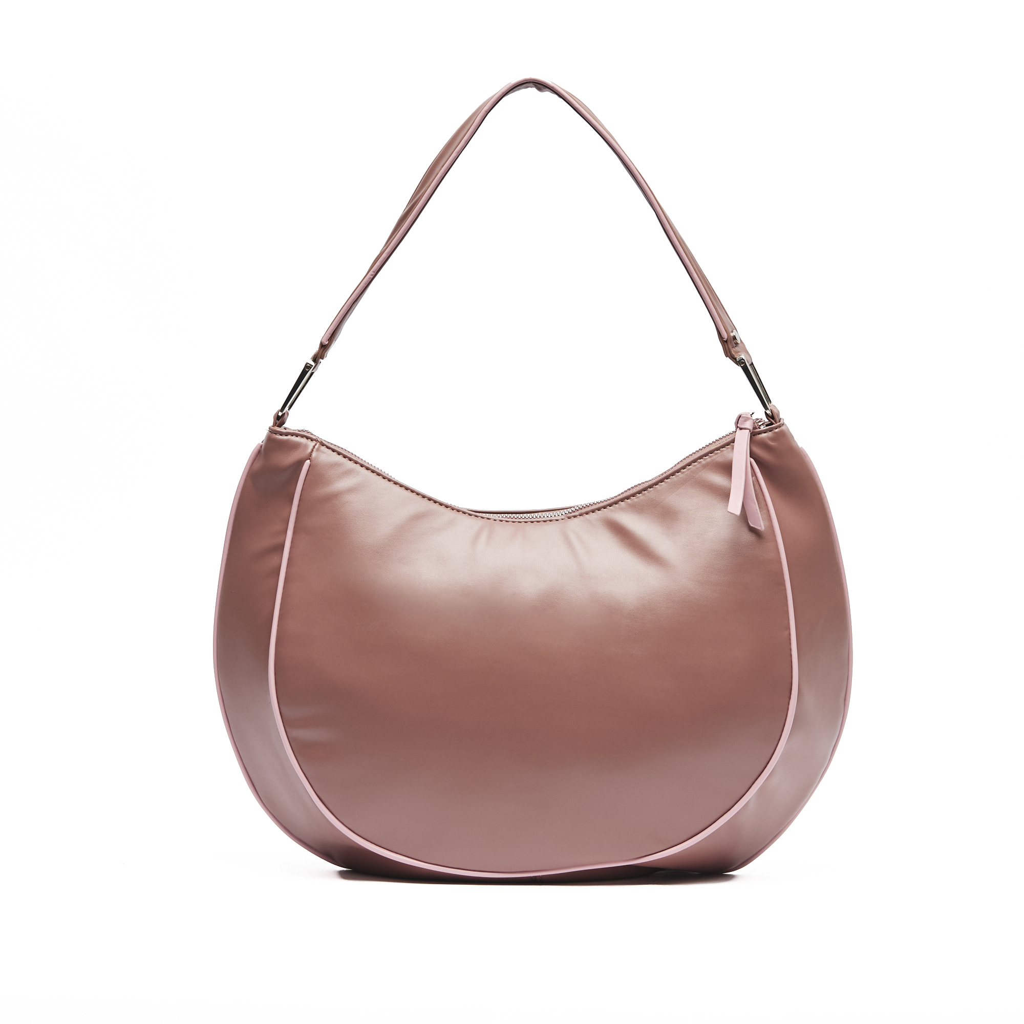 Cartera de PU liso con vivos y tiracierre a contratono. Cuenta con correa larga extraíble.